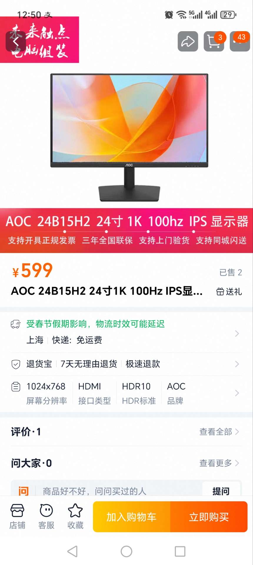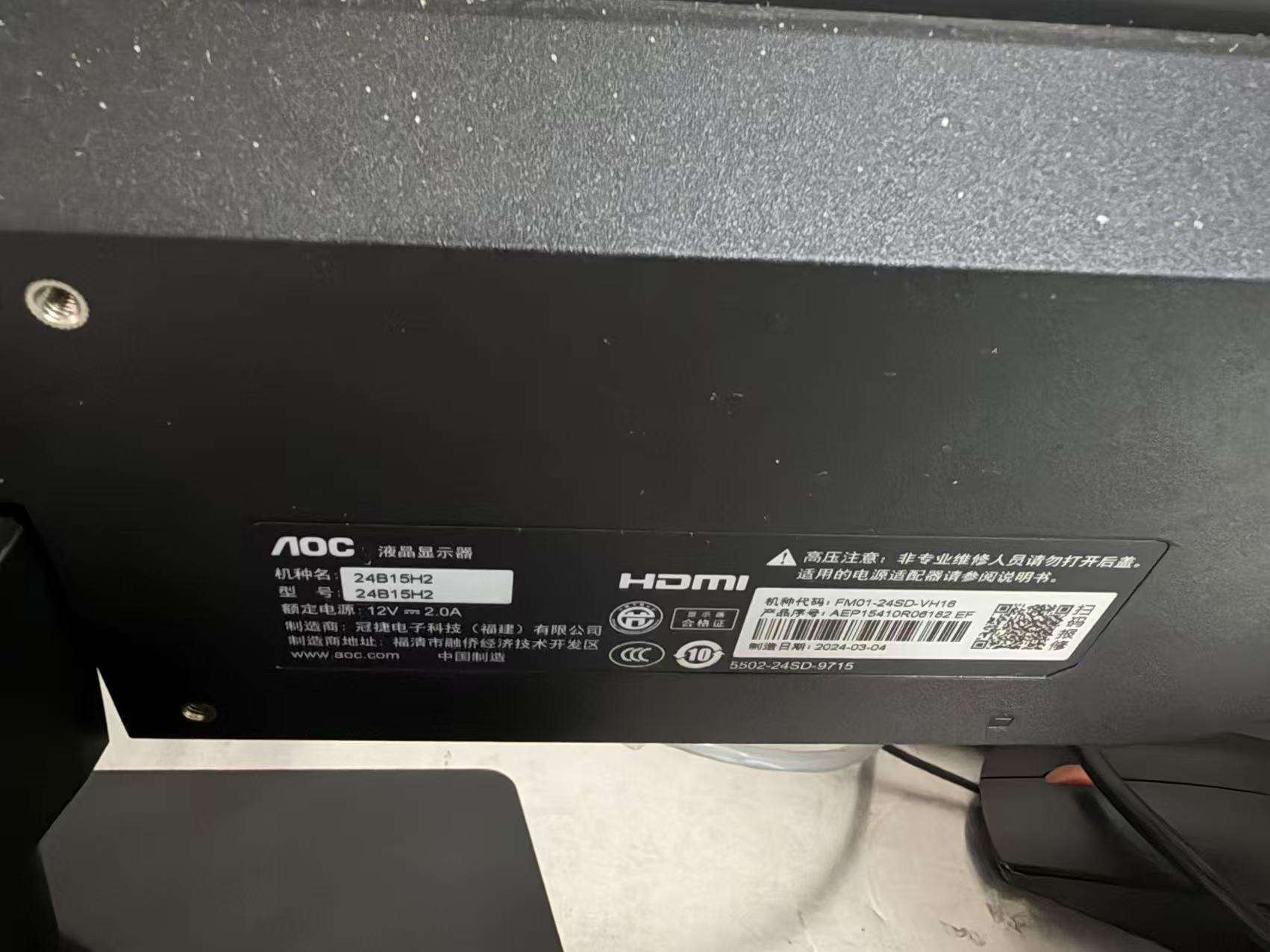 AOC 24B15H2 24寸显示器 2024年3月产