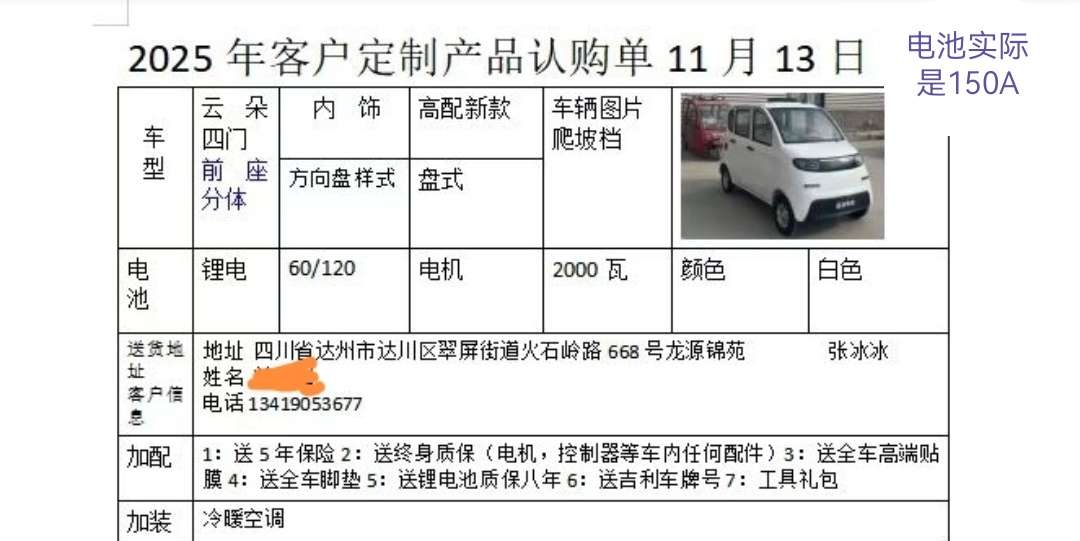 全新,只跑了几百公里。锂电池60v,150A,有冷暖空调。最高时速44km/h.续航里程100Km。