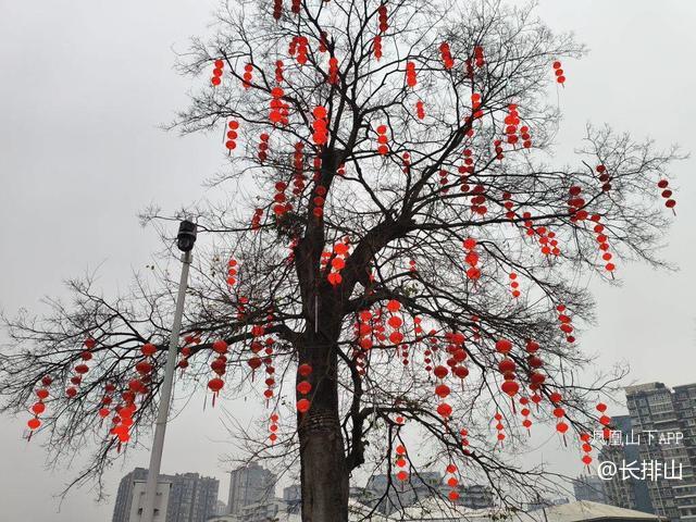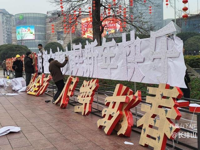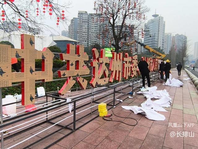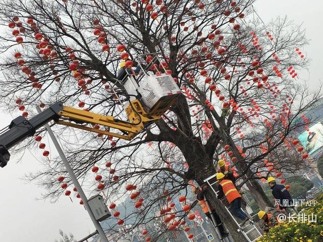在西外人民广场喷水池边,市政工程工作人员正在往树上挂小红灯笼,装饰夜间灯光和新年新气象的节日氛围。