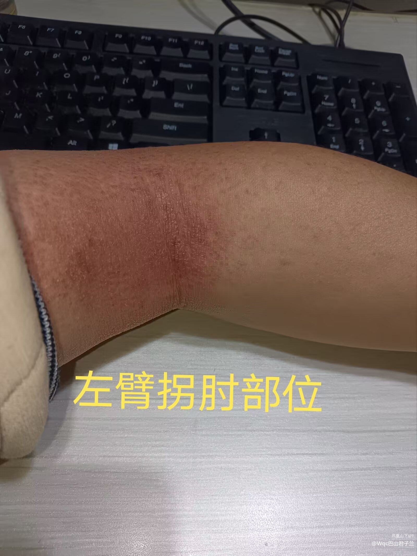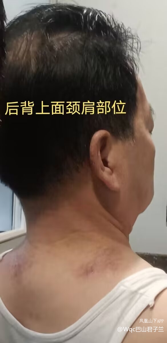 回到达州,我去吴某芳那里拿了12盒产品,开始正式调理。但是,因为这个产品里面有辣椒成分,加之是盛夏时节,灼热、瘙痒得让人受不了,而且越来越严重。浑身上下一会儿这里痒,一会儿那里痒。我的后背靠近颈肩部位和脖子上的皮肤出现大面积红斑,后来逐渐变成黑褐色,而且变成了松树皮、癞蛤蟆一样干裂的硬块,又像干裂的稻田里的泥块,疤疤癞癞的,非常粗糙,难看,自己照镜子看着都恶心。还有很多小疮,溃烂了,用手摸,感觉全是裂口和脓血。后来皮肤稍微变软了,又变成了鱼鳞一样的皮屑。同时,我的右手臂拐肘内侧,也出现了大面积红斑。风池穴的胀气又反弹了,继续发胀。大概9月中旬的时候,我不得不停止使用通络伤痛膜。经过多次沟通,10月23日,我把剩余的两盒通络伤痛膜退还给了吴某芳。吴某芳劝我继续使用产品,而且要加大剂量,说症状会慢慢消失。我根本受不了了,而且继续使用,不仅意味着更加痛苦,还意味着继续烧钱,所以我坚持退还产品。可是,感染继续扩散。再后来,我左手臂拐肘内外侧,左臂膀上方外侧也出现了红斑,有很多疹子,用手摸,感觉皮肤很粗糙,没有一点弹性。我不敢告诉家里人,担心他们看了很恶心。同时,我的头部奇痒无比,我问了理发店的师傅,叫我买了二硫化硒洗头,才有好转,可是后脑勺两侧又出现大面积结痂,右边比左边严重。我把痂壳抠下来,是干的,但是第二天又会长出来。