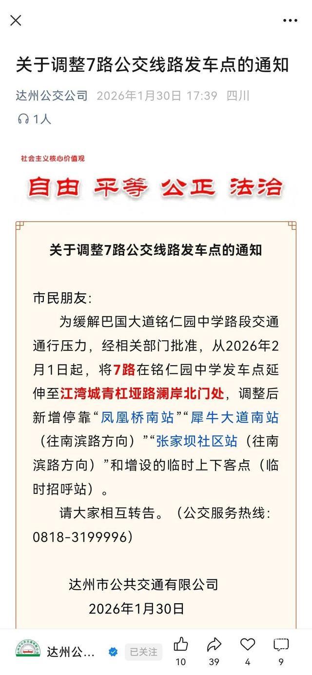 达州这条公交线路起始站点有变化
