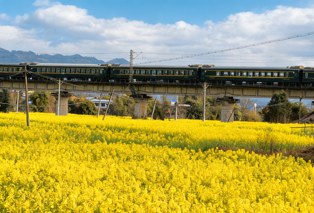 🌸亮点:连片的金黄花海铺展在大地上,微风拂过,泛起层层金色波浪。最令人惊艳的,莫过于列车穿行花海的浪漫画面。当火车在金黄的油菜花田上疾驰而过,钢铁长龙与柔美花海形成强烈对比,成为麻柳镇春日限定的独特景观。