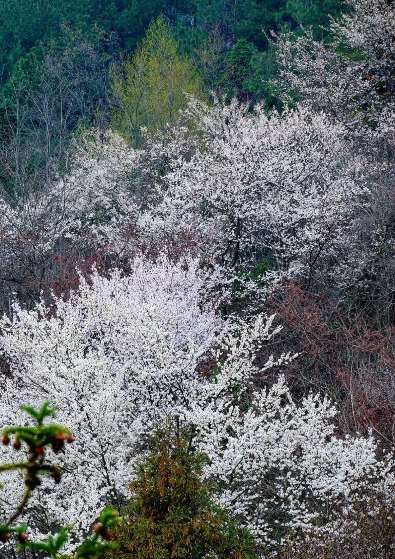 🌸亮点:两万余亩李花争相绽放,远远望去,漫山遍野白得发光,像是春天给大地开了美颜滤镜。