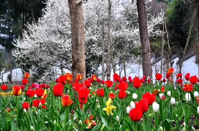 🌸亮点:李花开放时漫山遍野,犹如白雪茫茫,彩色房子掩映其中,与弯弯曲曲的乡间小路交织成一幅美丽的画卷。