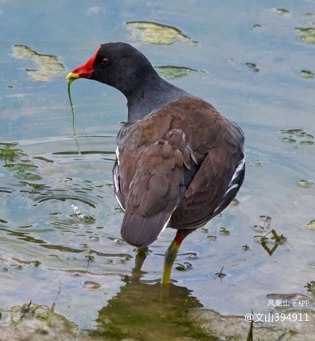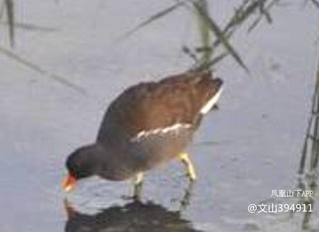形态特征。成鸟体长30~38cm,体重192~493g,两性体色相似,通体黑褐色略带紫色光泽,最明显的特征是:喙基部和额甲为鲜艳的红色,喙尖端浅黄绿色,从胸部到两胁带有白色纵纹,尾下覆羽两侧为白色、中央黑色,游泳翘起尾部时白斑格外醒目。脚为黄绿色,趾带有窄蹼,适合在浅水区和水生植物间活动,和你图片里的特征吻合。 栖息与习性黑水鸡偏好栖息在有挺水植物遮蔽的淡水湿地、芦苇丛、沼泽、稻田、池塘浅水区,基本不会在咸水活动,且不耐寒冷,在中国分布广泛:长江以北多为夏候鸟,长江以南多为留鸟。擅长游泳和潜水,遇到危险会迅速躲进水草,不擅长长途飞行,飞行时会紧贴水面,飞不远就会再次潜入草丛隐蔽。属于杂食性鸟类,主要以水生昆虫、蠕虫、螺类,以及水生植物的嫩芽、种子为食。