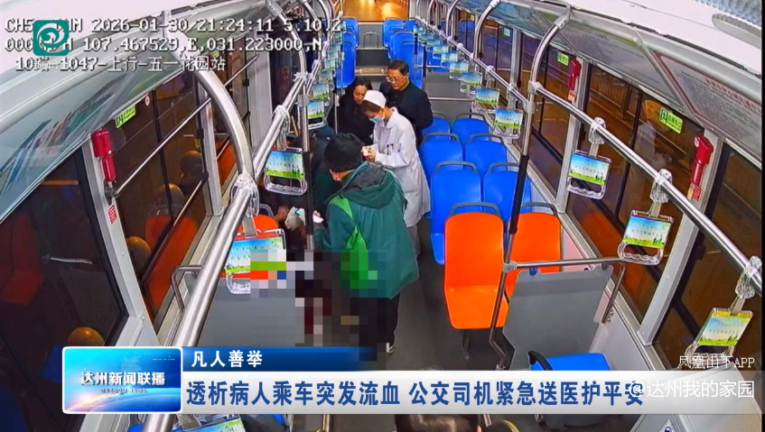 危急时刻见真情,公交车厢暖人心。1月30日晚,达州10路公交上一名透析老人突然流血不止,驾驶员费文华果断调整路线,在全车乘客全力配合下紧急送医,用责任与速度为生命护航,让助人为乐的暖流涌动在城市夜空。